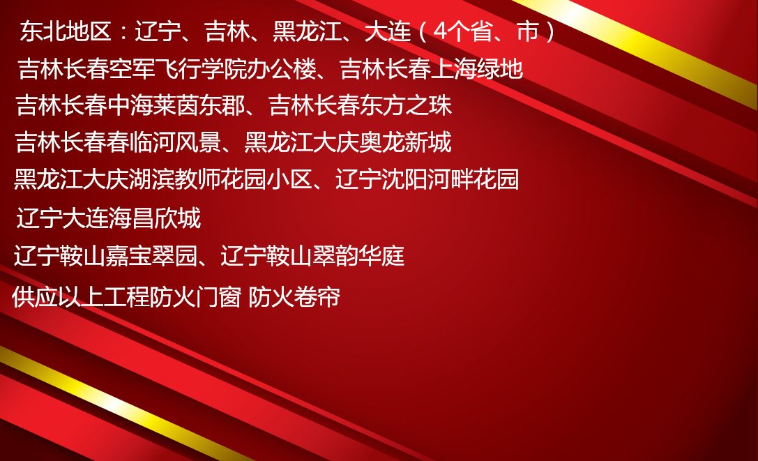吉林长春空军飞行学院办公楼、吉林长春上海绿地、吉林长春中海莱茵东郡、吉林长春东方之珠、吉林长春春临河风景、黑龙江大庆奥龙新城、黑龙江大庆湖滨教师花园小区、辽宁沈阳河畔花园、辽宁大连海昌欣城、辽宁鞍山嘉宝翠园、辽宁鞍山翠韵华庭