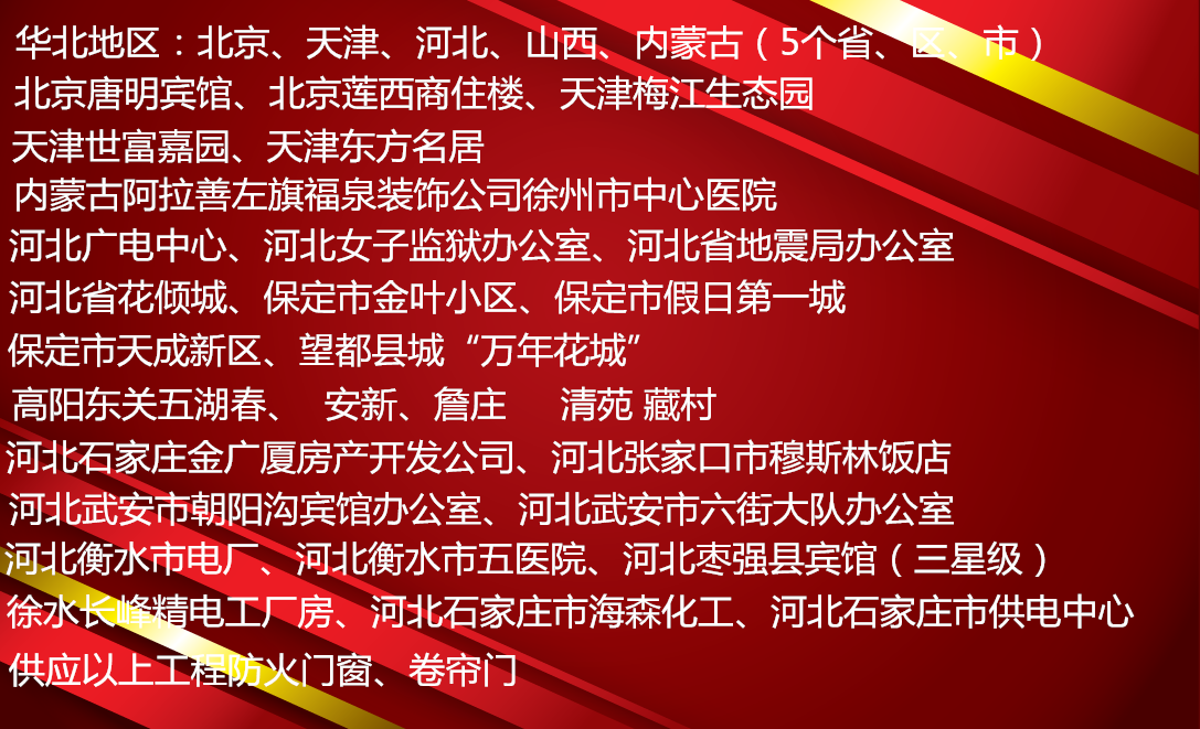 分享到:北京唐明宾馆、北京莲西商住楼、天津梅江生态园、天津世富嘉园、天津东方名居、内蒙古阿拉善左旗福泉装饰公司徐州市中心医院、河北广电中心、河北女子监狱办公室、河北省地震局办公室、河北省花倾城、保定市金叶小区、保定市假日第一城、保定市天成新区、望都县城“万年花城”、高阳东关五湖春、 安新、詹庄 清苑 藏村 、徐水长峰精电工厂房、河北石家庄市海森化工、河北石家庄市供电中心、河北石家庄金广厦房产开发公司、河北张家口市穆斯林饭店、河北武安市朝阳沟宾馆办公室、河北武安市六街大队办公室、河北衡水市电厂、河北衡水市五医院、河北枣强县宾馆(三星级)、河北枣强县玻璃钢集团、内蒙乌拉特前旗宾馆、内蒙东乌旗文化局、内蒙赤峰市平庄建设银行、内蒙呼和浩特新乌兰饭店、内蒙呼和浩特悦嘉宾馆、内蒙满洲里富豪城、内蒙满洲里“富豪家园”、内蒙满洲里“俄罗斯风情园”、内蒙满洲里“佳润华庭”、山西省埃柯拉商务大酒店、山西省平遥县人民法院办公楼、大同市复地紫城、大同市尚府小区、大同市金都御景、大同市美好家园、大同市罗马城、大同市孟县交警高速、太原市丽华苑小区、太原市景秀苑小区、太原市御景苑小区、太原市小店区交通宾馆、寿阳县平安小区、榆次新兴文教城小区、榆次晋福家园小区、榆次秋村新区
