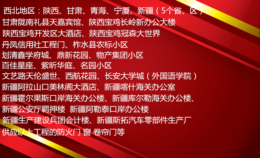 甘肃陇南礼县天嘉宾馆、陕西宝鸡长岭新办公大楼、陕西宝鸡开发区大酒店、陕西宝鸡冠森大世界、丹凤信用社工程门、柞水县农标小区、划清鑫学府城、鼎新花园、物产集团小区、百佳星座、紫昕华庭、名园小区、文艺路天伦盛世、西航花园、长安大学城(外国语学院)、新疆阿拉山口美林阁大酒店、新疆喀什海关办公室、新疆霍尔果斯口岸海关办公楼、新疆库尔勒海关办公楼、新疆公安厅羁押楼、新疆阿勒泰口岸办公楼、新疆生产建设兵团会计楼、新疆斯拓汽车零部件生产厂