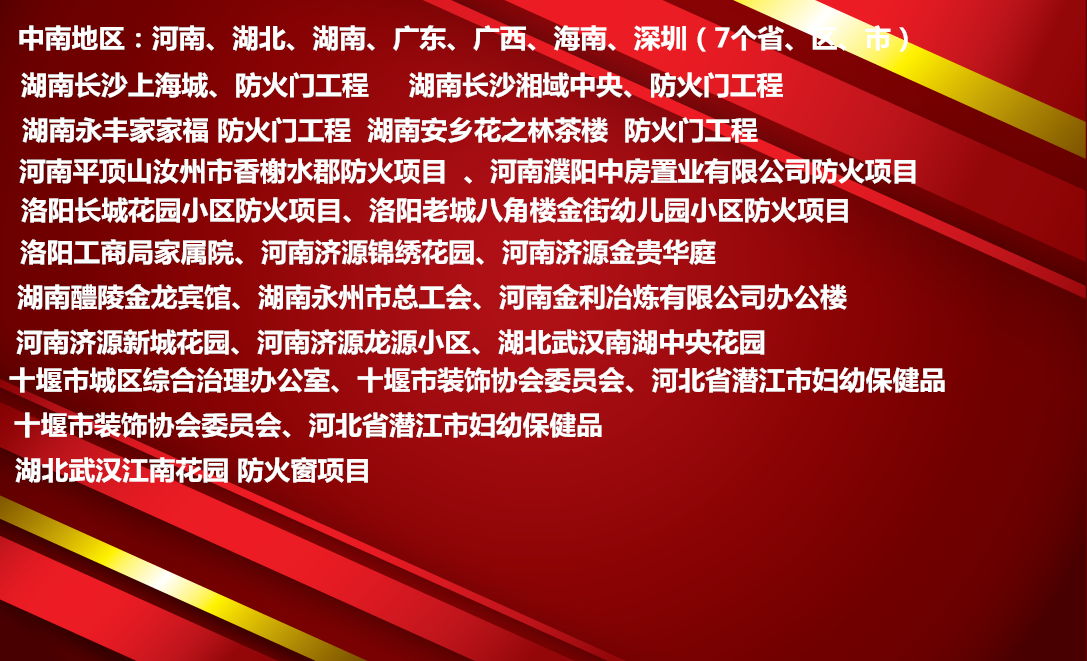 湖南长沙上海城、湖南长沙湘域中央、湖南永丰家家福、湖南安乡花之林茶楼、湖南醴陵金龙宾馆、湖南永州市总工会、河南金利冶炼有限公司办公楼、河南平顶山汝州市香榭水郡、河南濮阳中房置业有限公司、河南濮阳物华房地产开发公司、韩国汗蒸连锁店、洛阳长城花园小区、洛阳老城八角楼金街幼儿园小区、洛阳中泰花庭、洛阳工商局家属院、河南济源锦绣花园、河南济源金贵华庭、河南济源新城花园、河南济源龙源小区、湖北武汉南湖中央花园、湖北武汉爱家国际、湖北武汉江南花园、十堰市城区综合治理办公室、十堰市装饰协会委员会、河北省潜江市妇幼保健品、广西大学